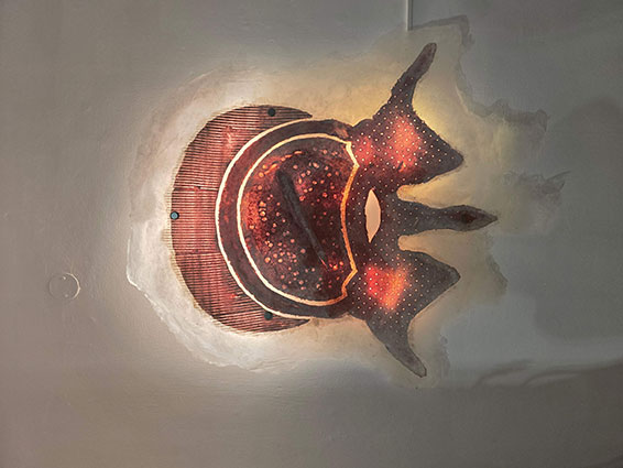 עבודת הנייר עם חוליית עמוד השדרה מחברת בין הגוף הפרהיסטורי לבין זה העכשווי, בין האלימות הקדמונית לבין הארכאולוגיה של האנושי. צורת הסהר הפנימית, המזוהה גם עם כלי הצור הרצחני, הופכת את הדימוי המדעי לדימוי פיוטי-אלגי: הירח והמוות חותכים יחד את הדף. דימויי האווטארים מחמר חותמים את התערוכה בממד פוסט־אנושי. הם נראים כגרסה גולמית של פנים דיגיטליות שהתממשו בחומר, כאילו השיבה החומרית היא ניסיון נואש להשיב נוכחות לעידן של היעדר גוף. רישום הגריד על פניהם מדגיש את תהליך התיווך, את המלאכותיות של זהות בעידן הסימולקרה.